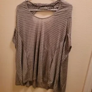 We have a new flowy stripped shirt for sale that is brown/gray, has a low neckline, pockets and original tags. The lightweight and soft material makes it easy to wear in any weather.