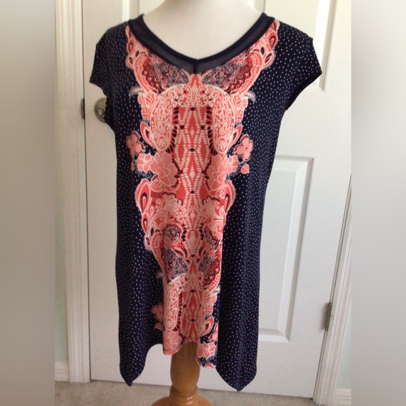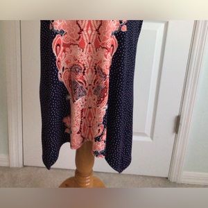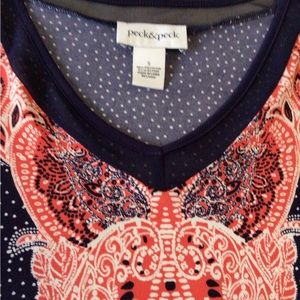Peck & Peck Ladies top. Beautiful, red white and blue paisley print down front of shirt with rest of top being navy blue with white polkadots. V-neck, short-cap sleeve and uneven hemline. Approximately, 27 inches long, and 20 inches from armpit to armpit. 96% percent polyester, 4% elastin for added comfort. Wash inside out on gentle, tumble dry. Excellent used condition, non-smoking home.