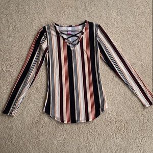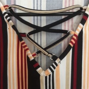 Cute striped multicolored top mostly black red and white and peach. Tried on but was too small so it hung in my closet. Perfect condition. Corset like v neck.