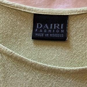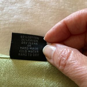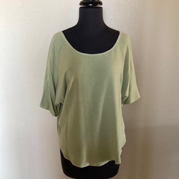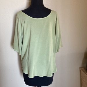 Pretty top in a cool green color, jewel neckline, short dolman sleeves, shirt hemline. Sleeves measured from neck down shoulder is 14 1/4”, length from neckline to hem is 20 1/2”.