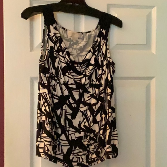 White and black with scoop neck and light elastic along bottom. Top straps are black elastic