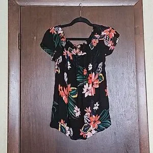 black flowy shirt with tropical flowers