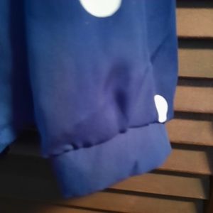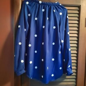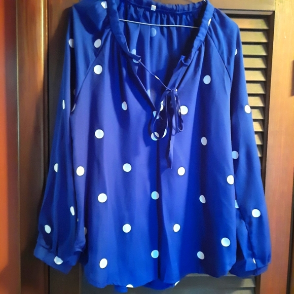 Silky blue polka dotted top with ties at neck. 3/4 sleeves . very pretty top. size XL but runs small