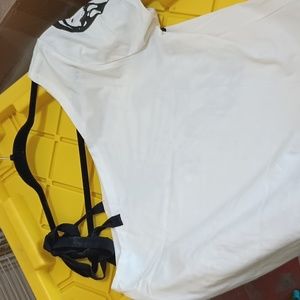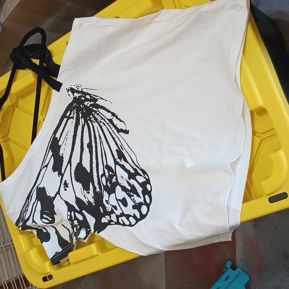Shein, White short sleeve, 1 ties on shoulder, butterfly t-shirt, size L, 62% polyester, 34% cotton, 4% elastane. Shoulders measure about 18" from left to right pit, from shoulder to hem approx. 22" Brand New and super cute!