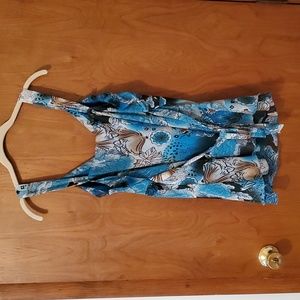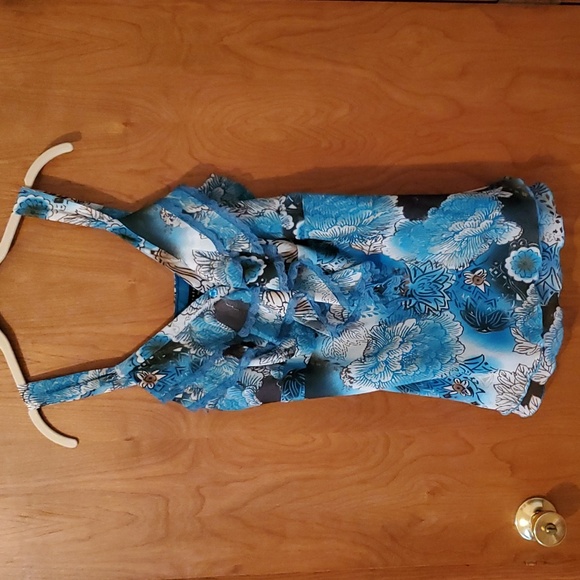 Teal and black top. Has lining underneath. There is a tie in the back and the front has a few buttons and ruffle. Very pretty. Size petite xl.