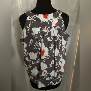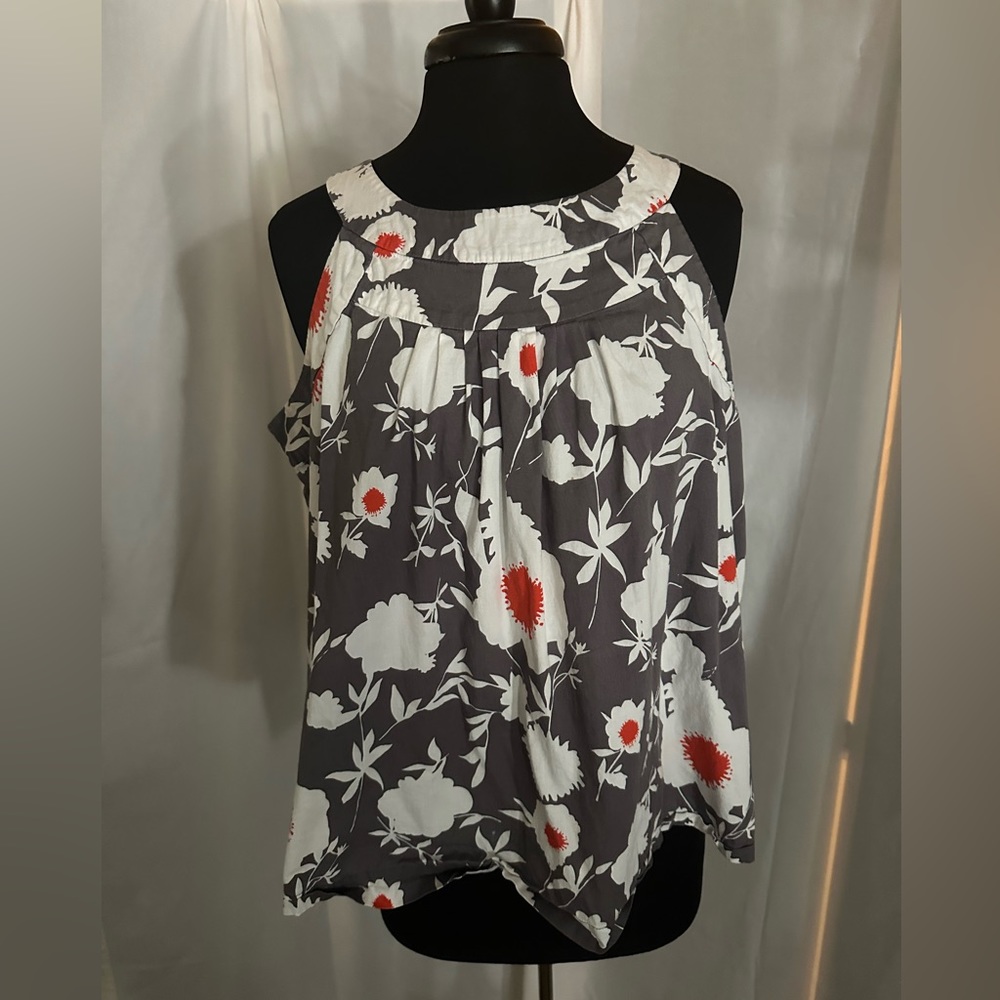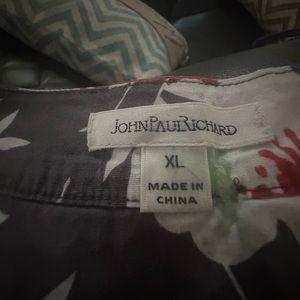 This is a great white and orange summer top. It has a rounded caller that also incorporates the sleeves. It is extra large in size.