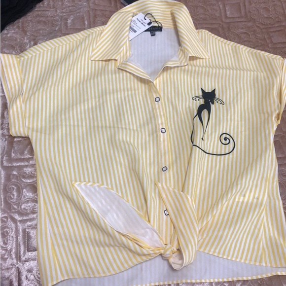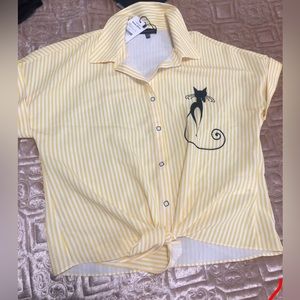 Bright yellow stripe blouse with cat print on side with cute bow !! *******European size 40 *********which in US is a medium
