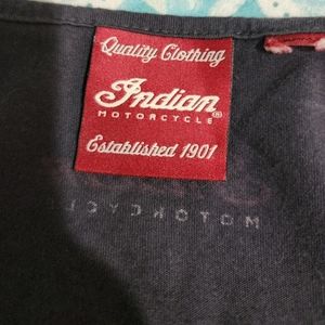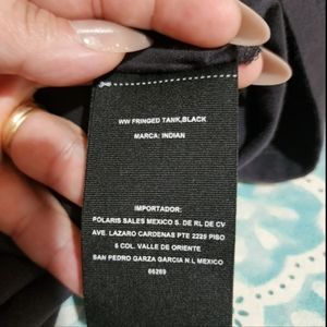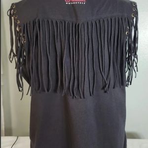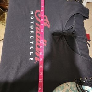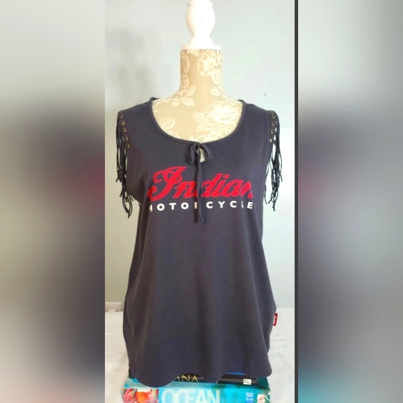 Indiana Motorcycle ladies sleeveless top.with fringe. Tag says its a size 2x, but probably fits an xl lady. 100% cotton gray with red and white writing