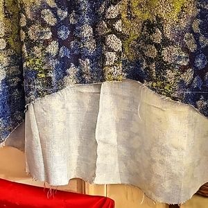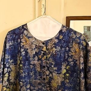 Blue and green multi-colored hi-lo top. Button down front placket. Banded collar. Frayed sleeve edges as well as hemline. Boxy cut.