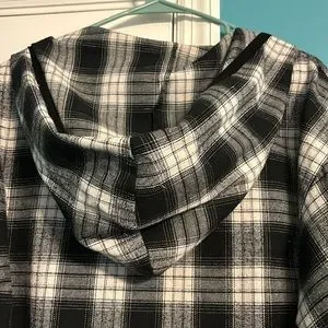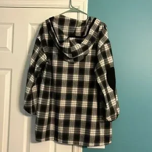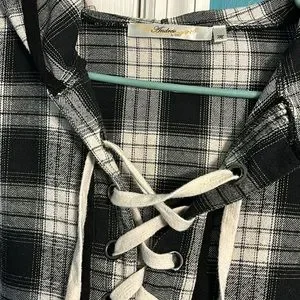 Black and white plaid long sleeves shirt with hoodie lace up in front back is 3” longer than front solid black patches on sleeves awesome with leggings