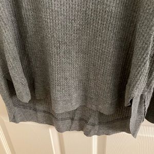Democracy, gray light wright waffle weave top. Ruffles around the elbow of the sleeve. Easy over the head fit.