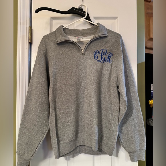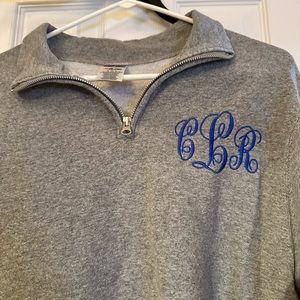 Fleece lined pullover; zip neck closure, long sleeve; monogrammed in blues with initials CLR