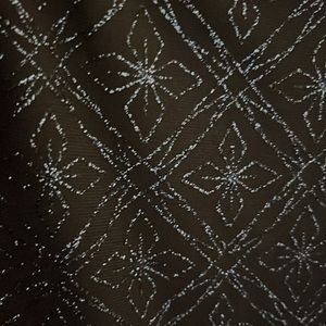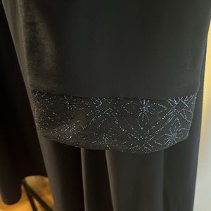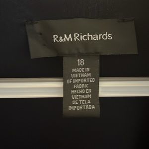Black sleeveless top with attacked jacket with slight flare with blue shimmering design on top, jacket and jacket sleeves. By R & M Richards, Size 18