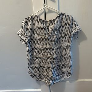 White and blue/gray top with tie sleeve detail and button neck closure