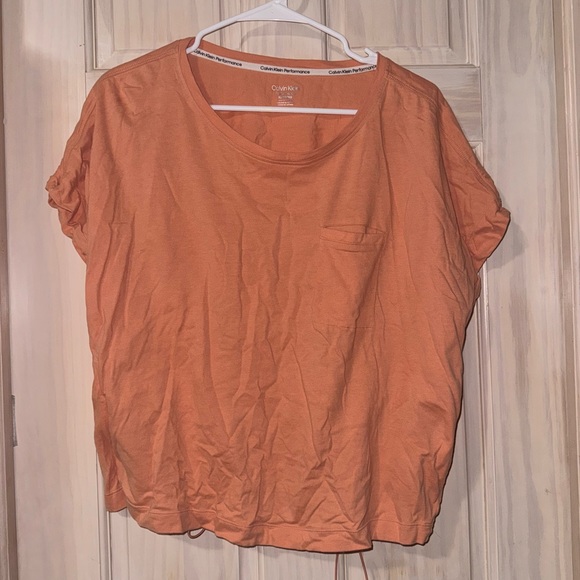 Orange top. Has string in the back to hinge it. Calvin Klein Performance brand.