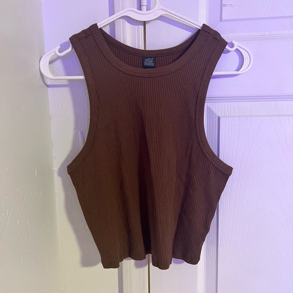Size large (but fits like a medium) brown top from target. Hardly worn.