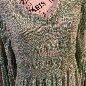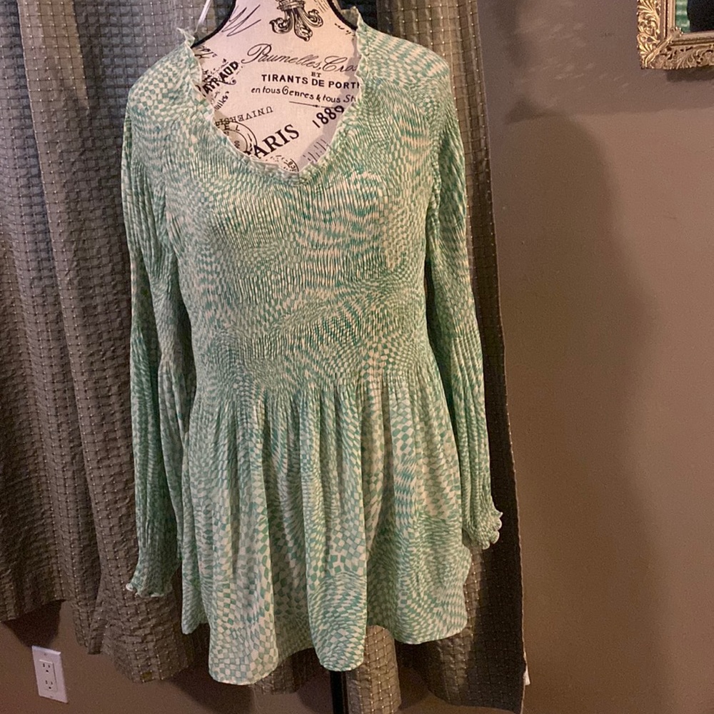 Sunny Leigh xL top, very flattering with elastic details at wrist, pleated top, flowing after bust line. It’s a light green small checked pattern.