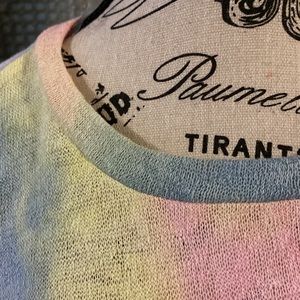 Lightweight Summer top. Pink, blue, yellow, and cream with short sleeves. Loose fitting with ruffle on bottom. Fits between waist and hips for length.