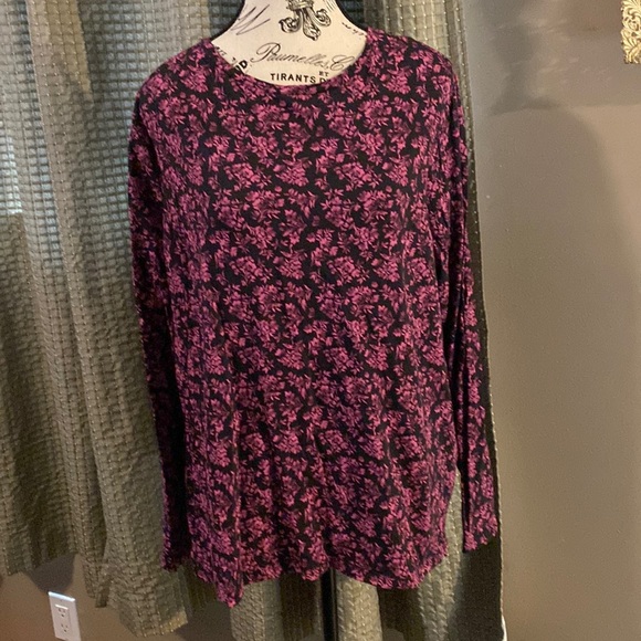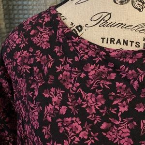 Stretchy black top with raspberry colored floral print, tunic length with long sleeves. Can be dressed up or worn casual.