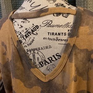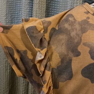 Tunic length camo top with ruffle detail, and back cut out design.