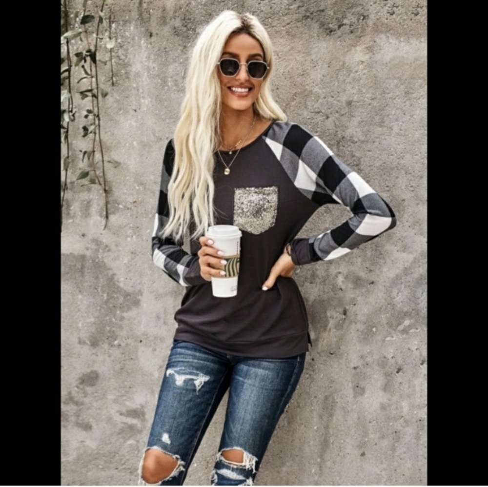 🖤 Shirt is black with black/gray/white checkered arms. The front chest pocket is gold sequence!