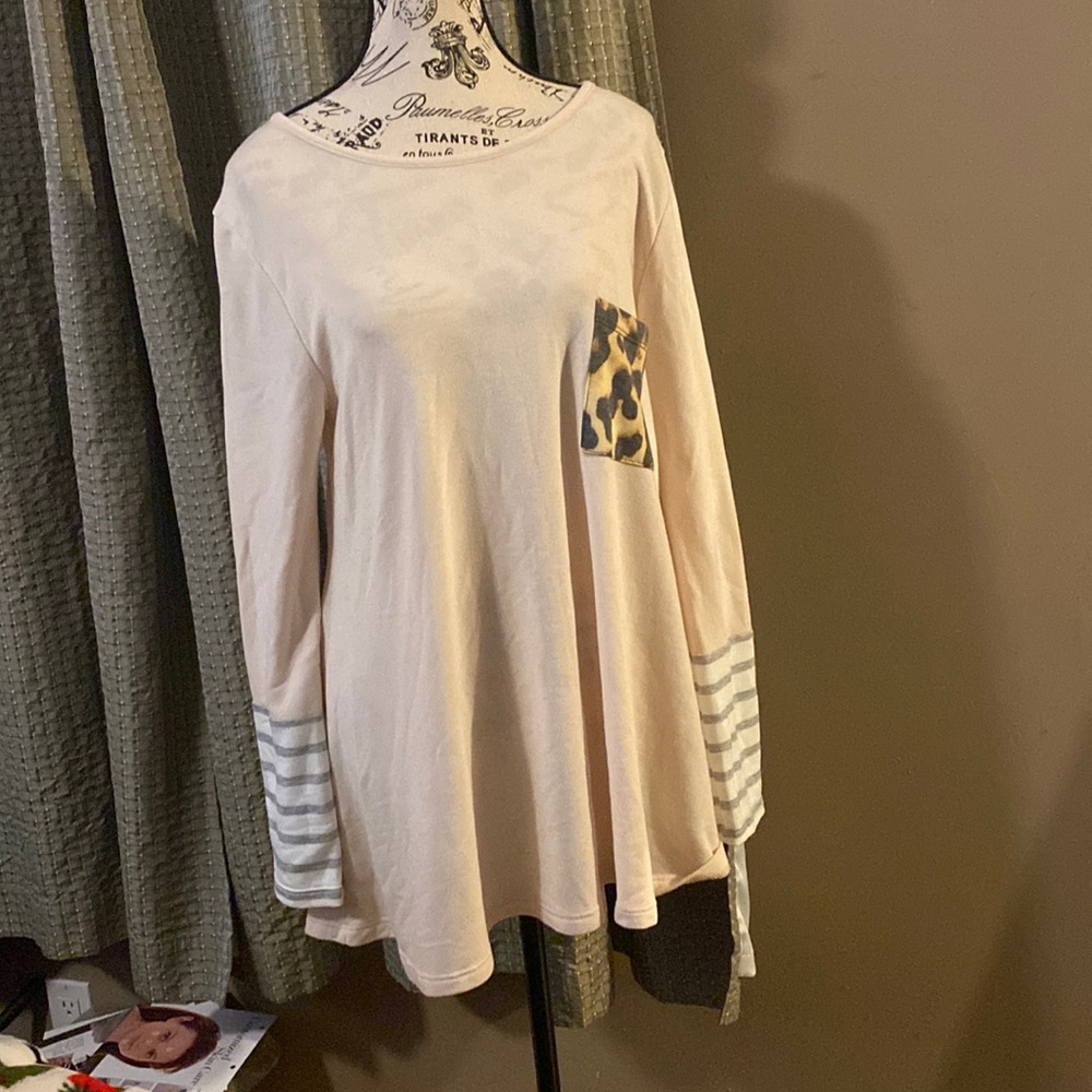 Boutique top, long tunic, cream color with leopard print pocket and striped end of sleeves. Made in USA