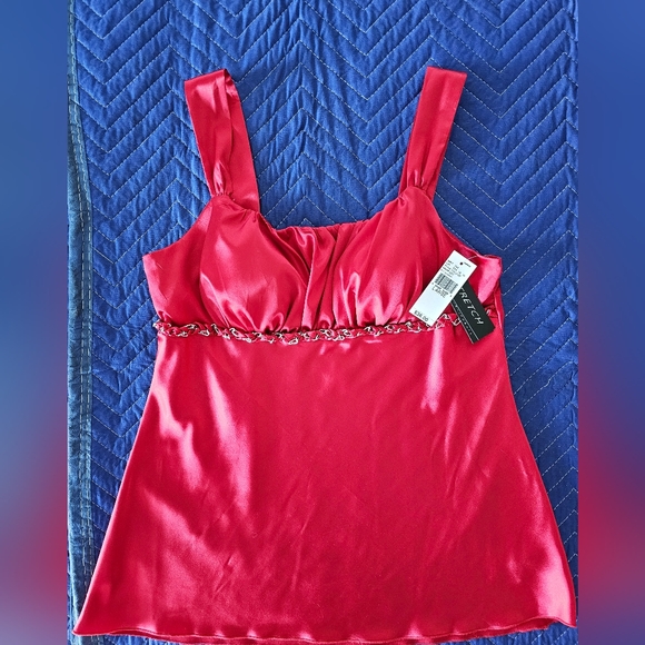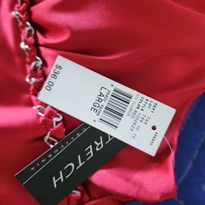red scrappy top, kinda silky fabric (polyester and spandex)