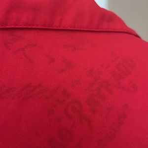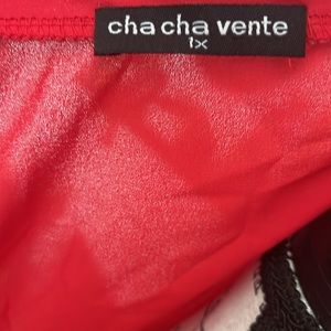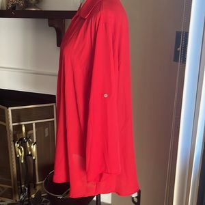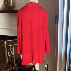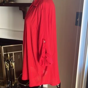 Red sheer collar, V-neck, long sleeve blouse. Size one X by. Cha Cha Vente.