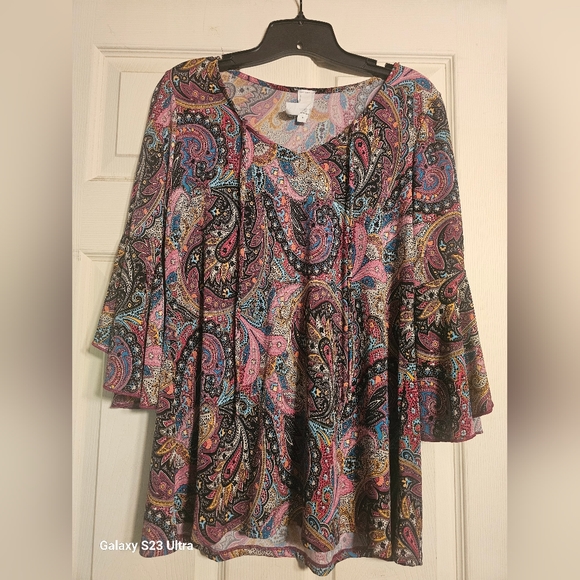 Vneck blouse multi color pasley. Quarter lenght bell sleeve with slit