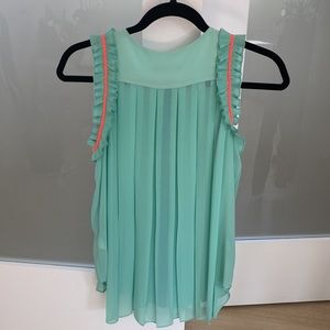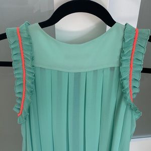 Pleated green sleeveless top with ruffle on the sides that has neon pink color