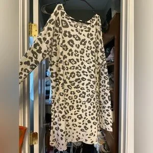 Animal print long sleeve sweater with cold shoulder detail, off white and grey