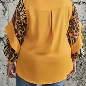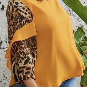 Colorblock Leopard Print Ruffle Trim Long Sleeve Round Neck Slight Stretch Top