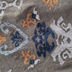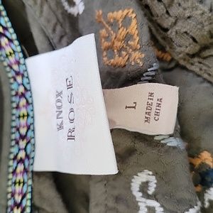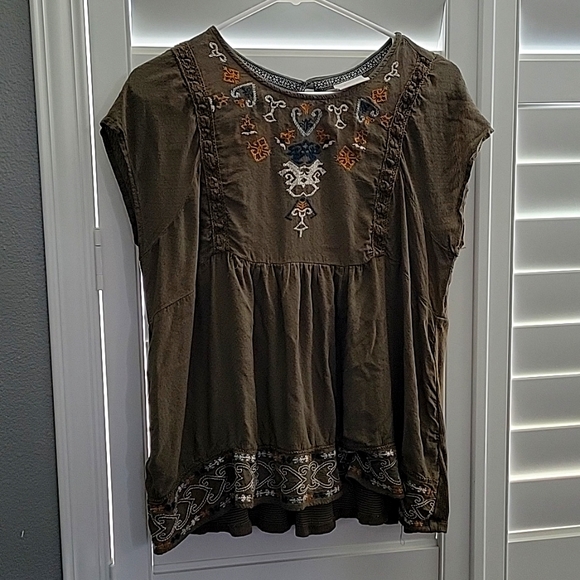 Cute summer top in olive green by Knox Rose. Soft and flowing. Beautiful embroidery along the upper bodice and around the hemline. Loop back closure. Size L