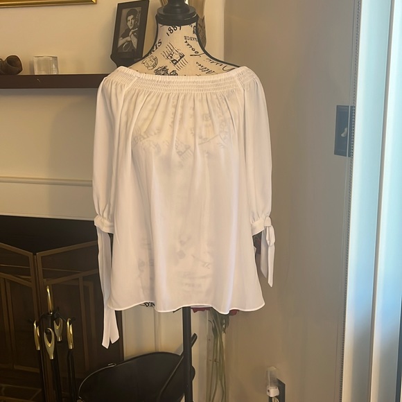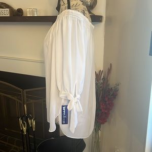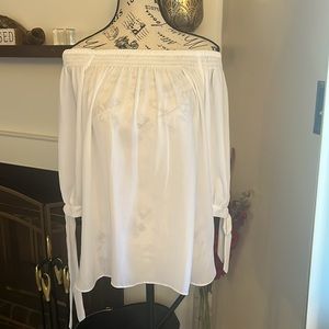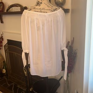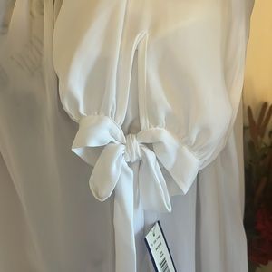 White sheer top with mid sleeves with ties. Able to wear the blouse off the shoulders. Size 8P by Nygard.