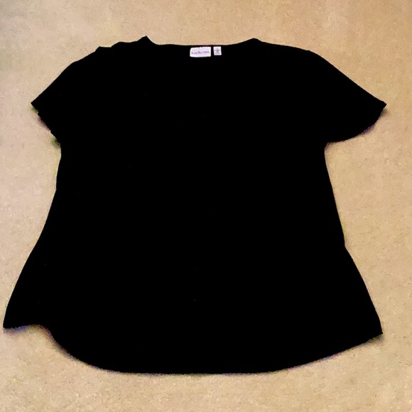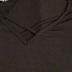 Black top made of polyester and spandex. Contoured hem and criss cross at the v neck