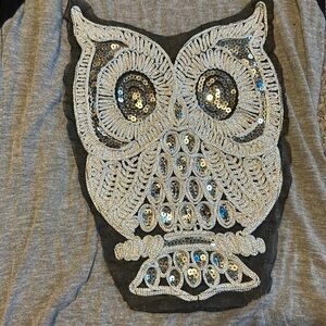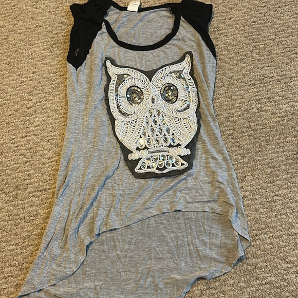 High low cut. The owl is very sparkly. Sleeves are short but not tank top short