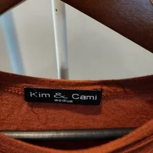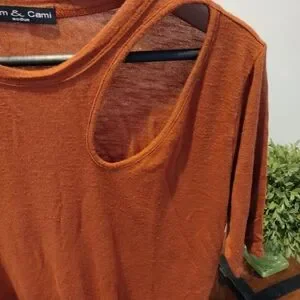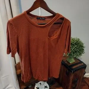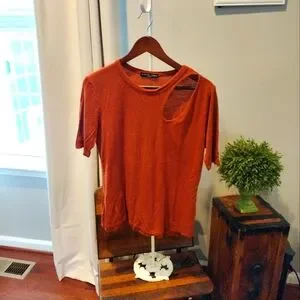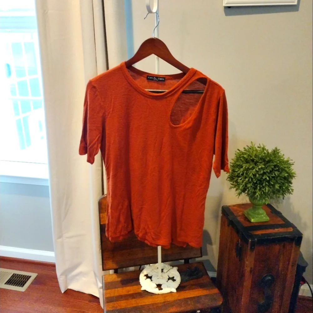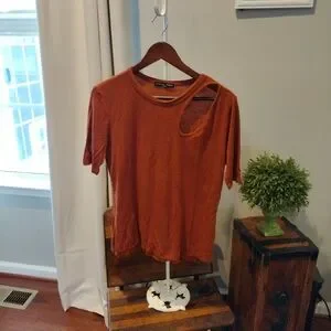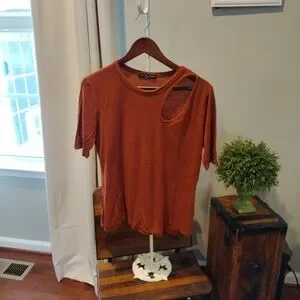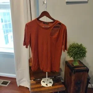 pretty burnt orange top can dress up or dress down has kind of that peekaboo shoulder on side pretty material worn a few times