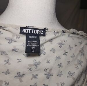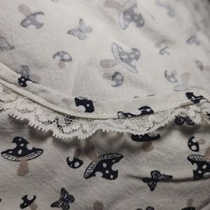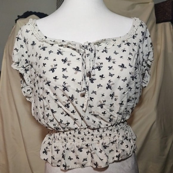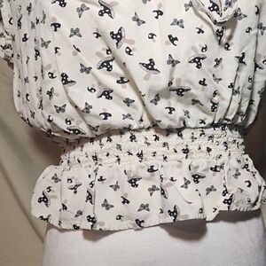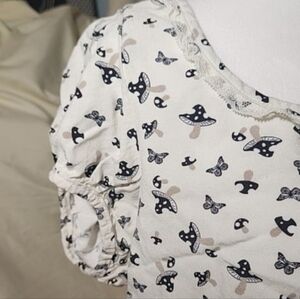 Beautiful butterflies and mushrooms print. Pretty petite ruffle on arms and around the neck line. Elastic around the waist.