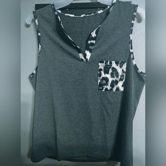 Gray sleeveless top with animal print. Never worn only tried on as it fits small. Its a large but fits more like a medium.