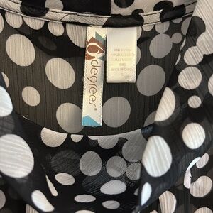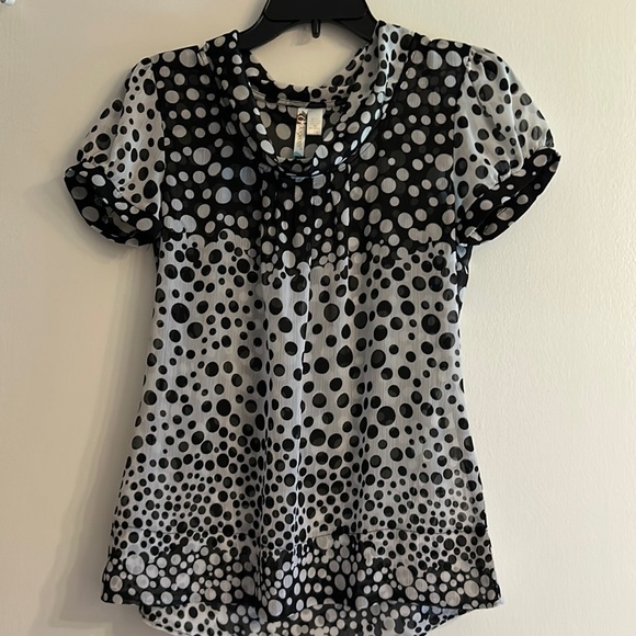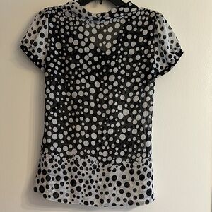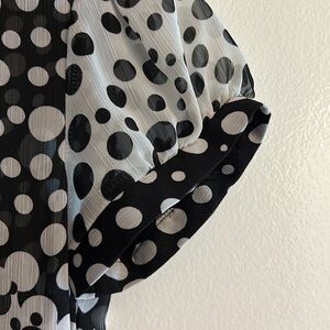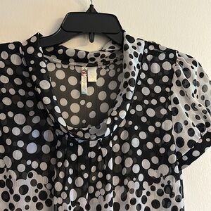 White, black, polka-dots, flowing collar, puffed sleeves
