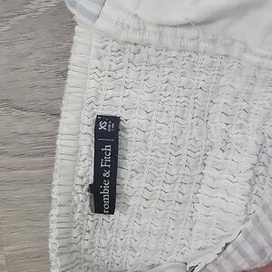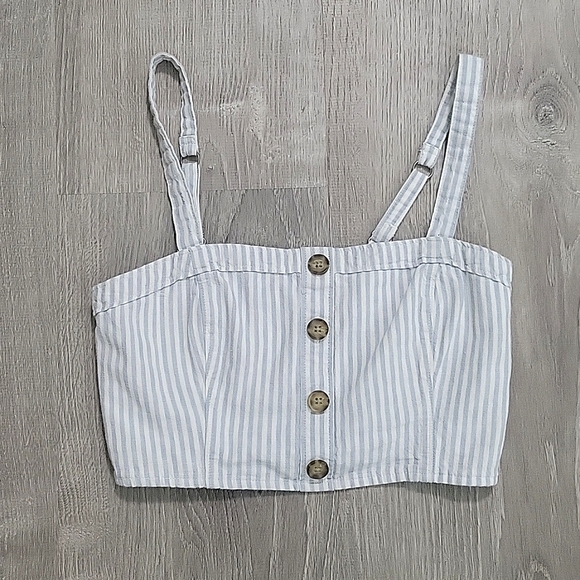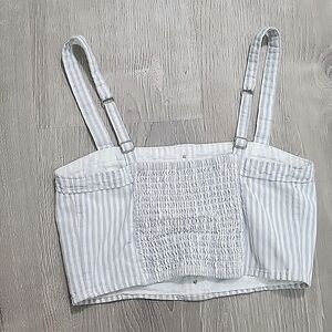 crop top with blue and white striped fake buttons down the middle stretch panel in the back adjustable straps