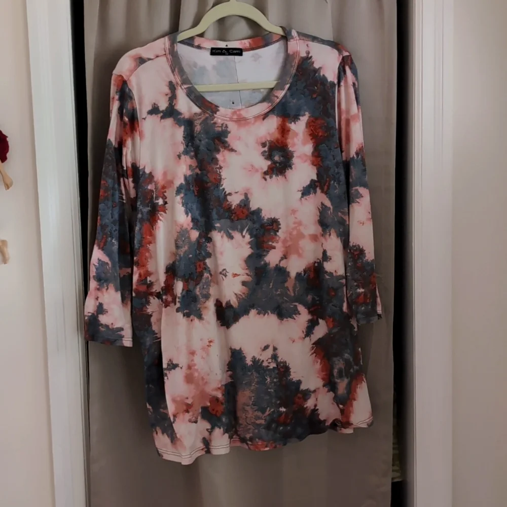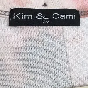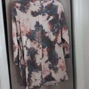 Kim & Cami splotched "ty dye" gray and pale rose colors, 3/4 sleeves and buttons up the back. Good flow with leggings / jeans.