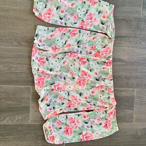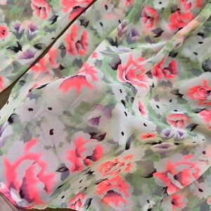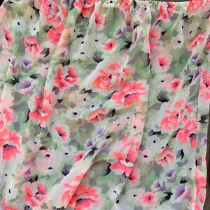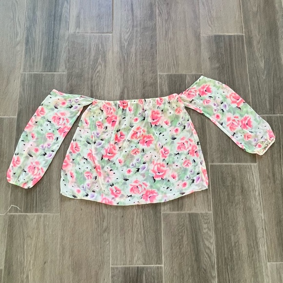 Off the shoulder, light weight material see through, with elastic on the chest area flow-y fit.