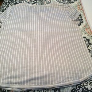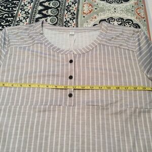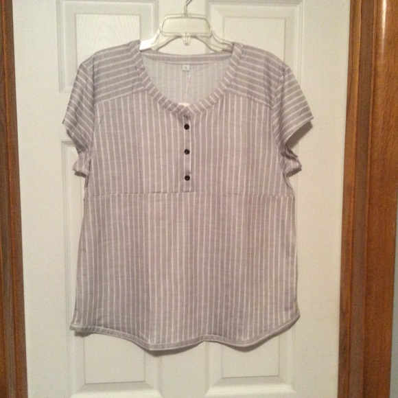 My loss is your gain, ordered this top online and it doesn’t fit but the site will not refund my money. NWT’s, size L 22in pit to pit, gray and white striped, short sleeves, non-smoking home.