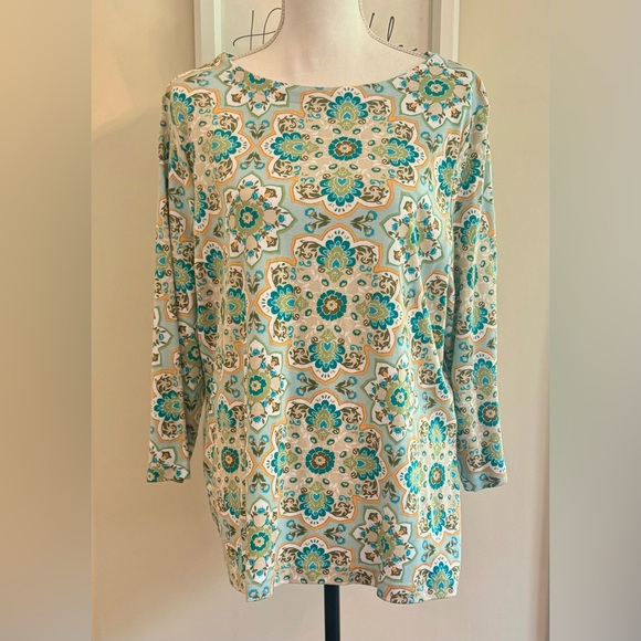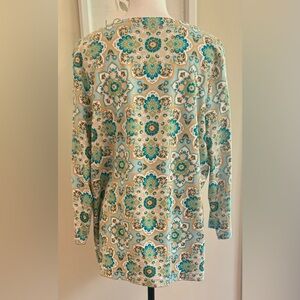 Cotton top in very good condition. 24 inches pit to pit; sleeve is 19 1/4 inches from shoulder seam to sleeve hem.