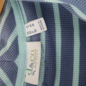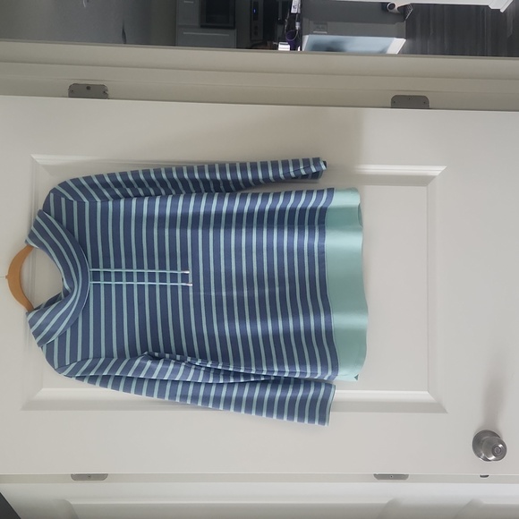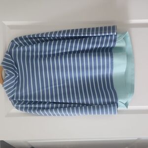Pretty striped side slit ladies top. Small sides look detail. Tunic style covers the butt, funnel neck with draw string. .Light mint and blue striped.