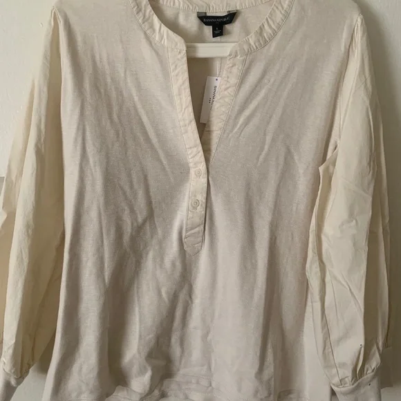 Cream colored woman’s Henley t shirt with cotton long sleeves. A great staple to have in your closet
