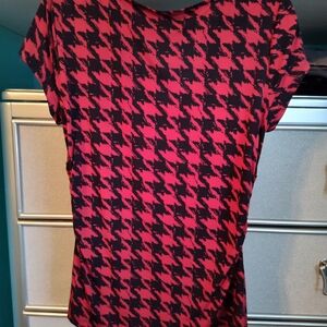 red and black print jersey material top. was a gift and didn't have any labels. fits like a medium. worn a handful of times.