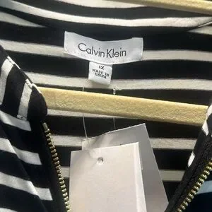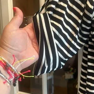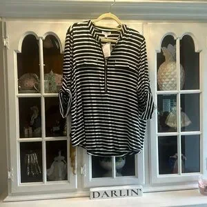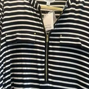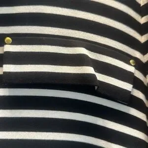 Beautiful black and white stripe top, with mandarin collar. Fun zipper detail with gold metal accents. PTP measurement 24 inches. Stretchy jersey fabric feel nicely weighted.