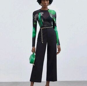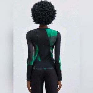 Modern color-block pattern printed mesh top.